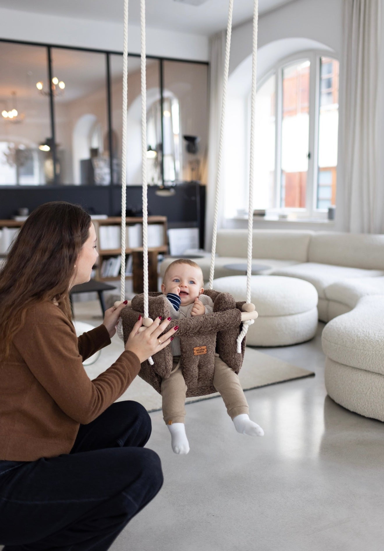 Our swings are made of high-quality wood, the cushions are filled with hypoallergenic silicone, and the rope is made of 100% organic cotton, ensuring durability and safety.